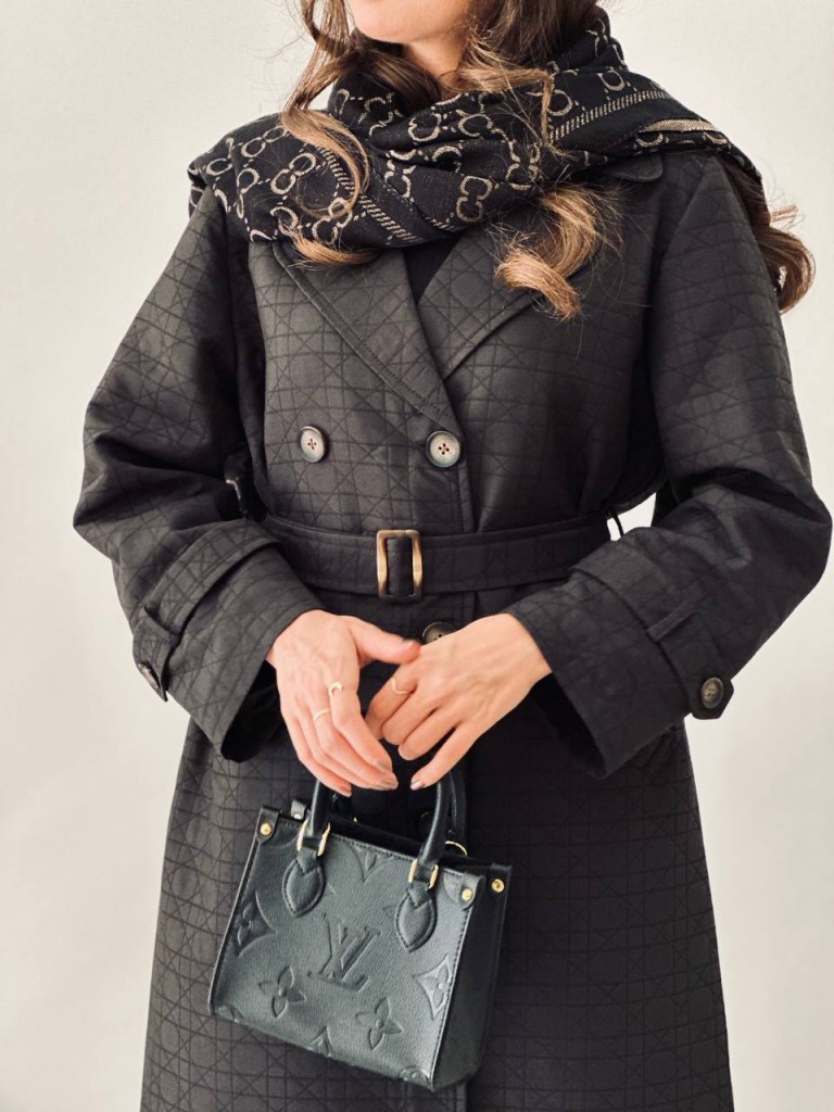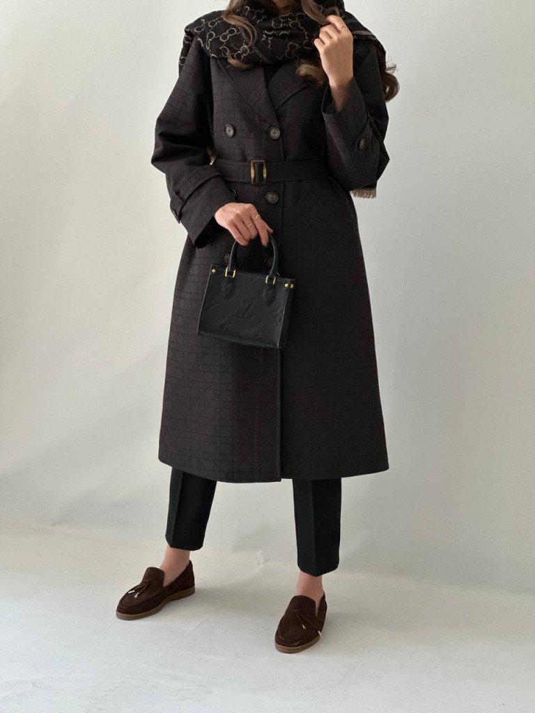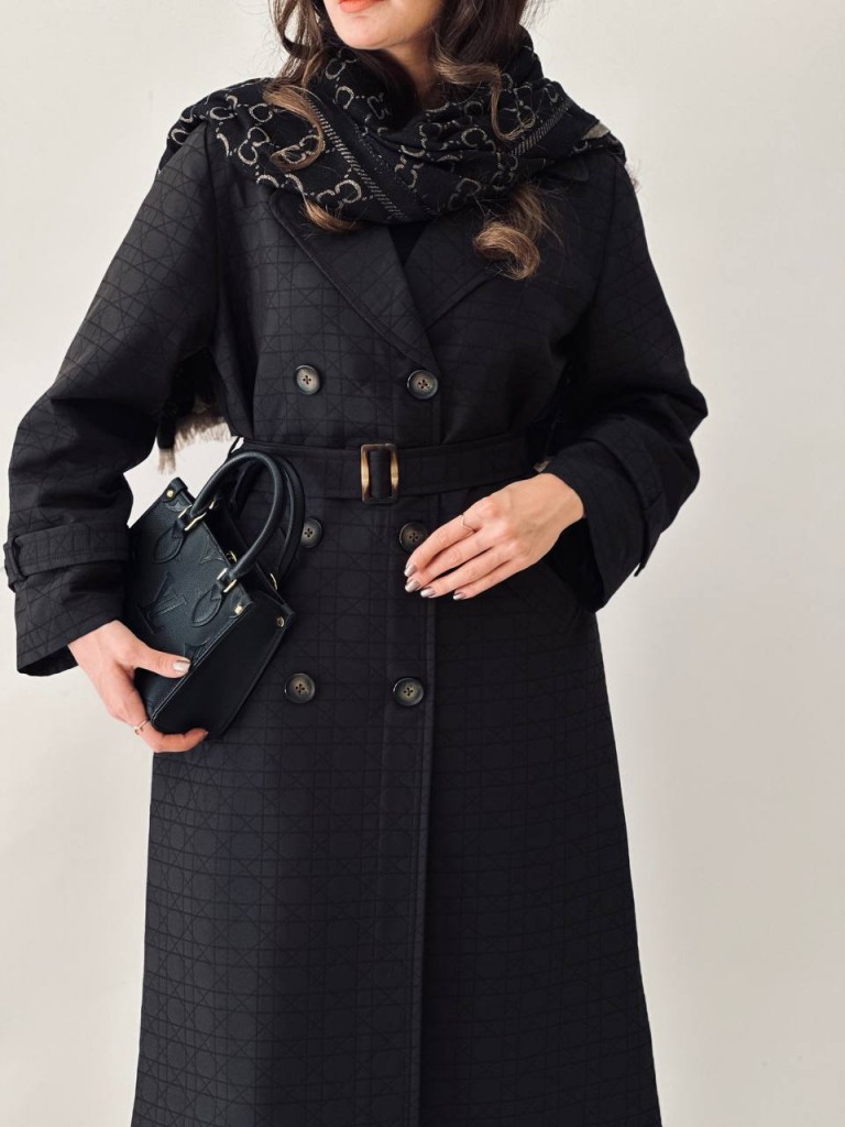 دکمه و کمربند دارد , کامل آستر کشی شده است . ( قد بلند کت پشتش چاک دارد )