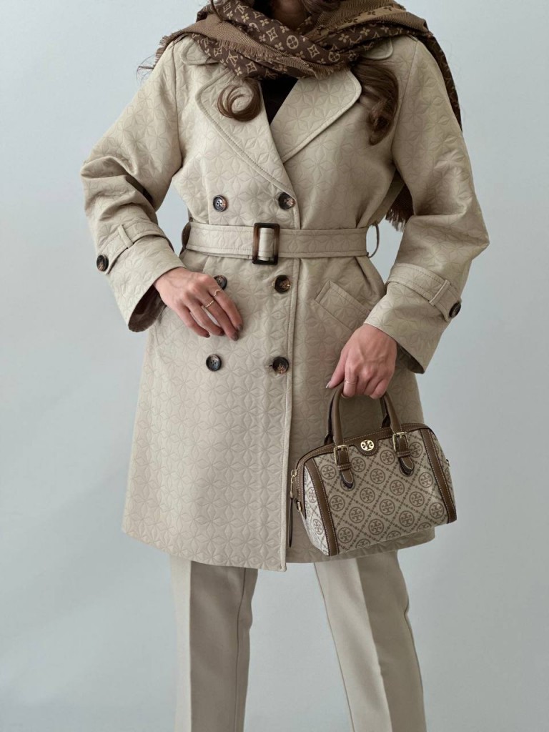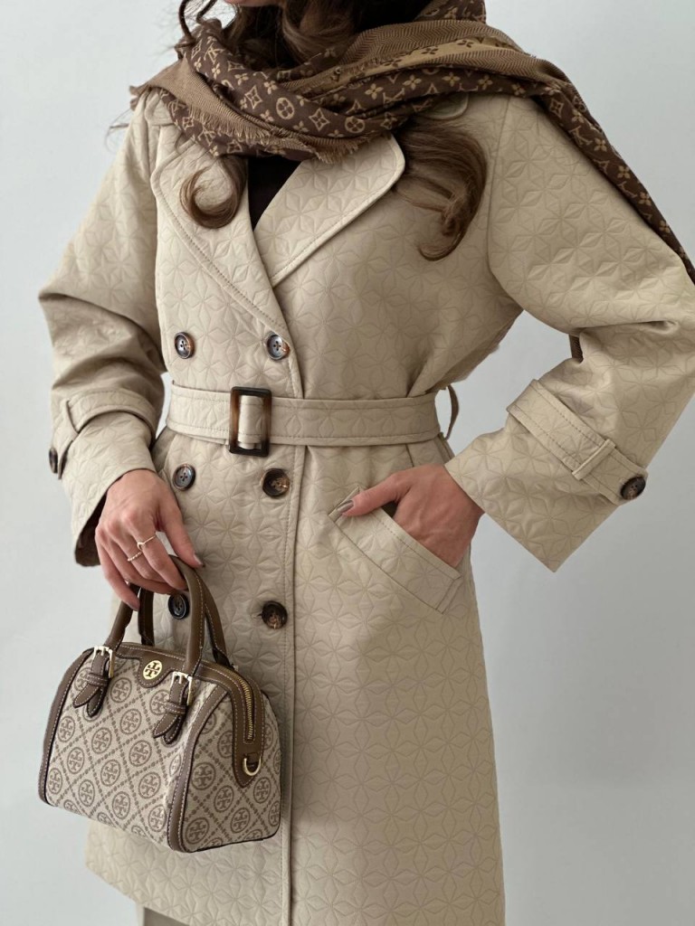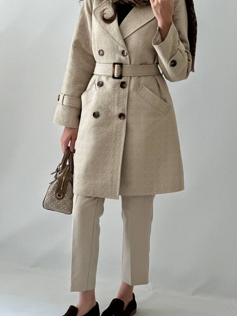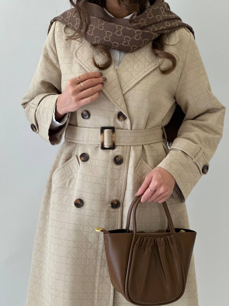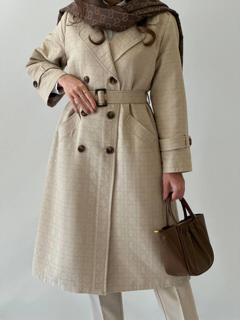 دکمه و کمربند دارد , کامل آستر کشی شده است . ( قد بلند کت پشتش چاک دارد )